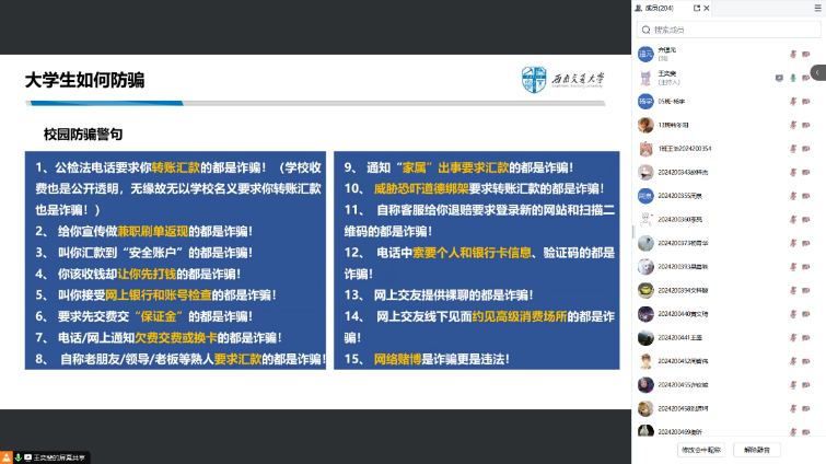 在会议过程中,现场的同学们积极听讲,线上的同学们认真观看,本次会议取得良好效果。通过此次反电信网络诈骗教育专题活动,学院研究生新生同学更加直观的了解电信网络诈骗的特点和危害,有利于提高同学们的安全防范和自我保护意识。