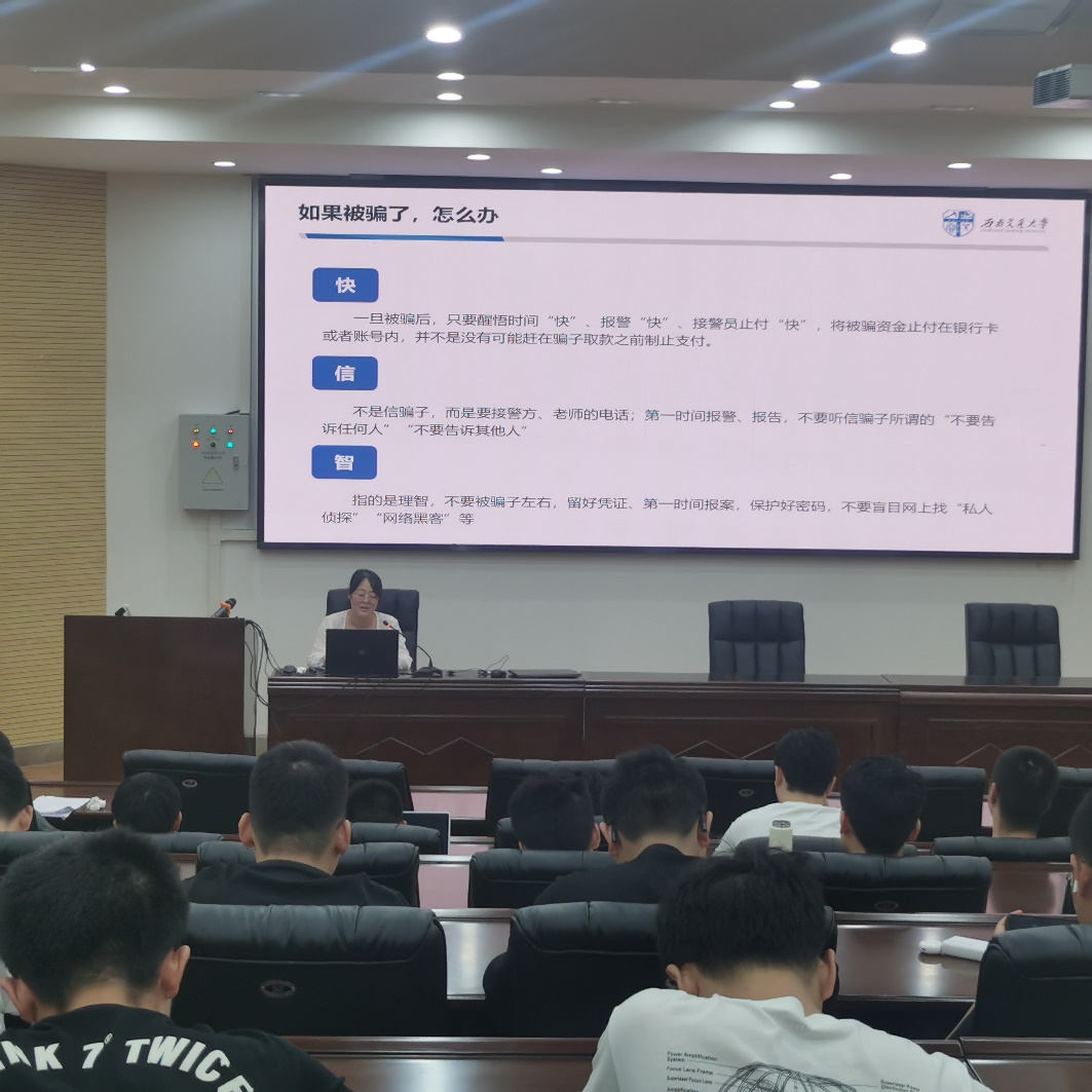 郭老师首先给同学们讲解了什么是电信网络诈骗。结合真实的案例和详实的数据,向同学们讲述了近年来电信网络诈骗的高发态势、电信网络诈骗的特点和犯罪分子实施电信网络诈骗的手段、类型及途径,加深了同学们对网络诈骗的了解和认识。