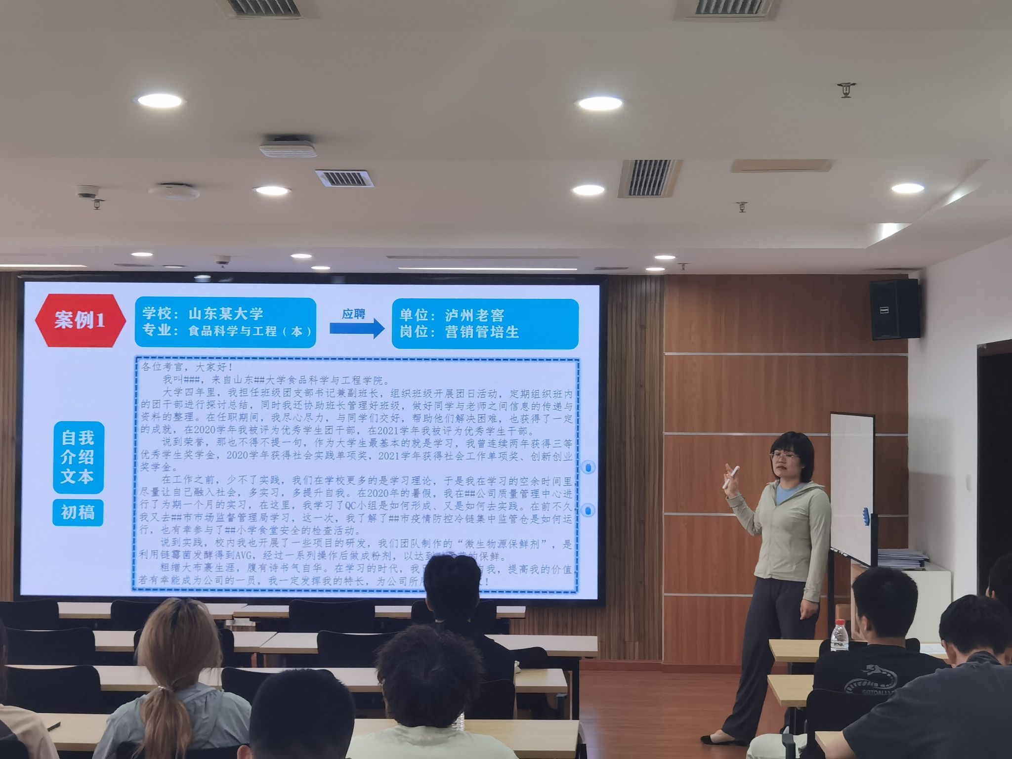 活动现场,主讲人张异老师从表达逻辑到实战技巧层层递进:结合真实求职案例,拆解 “一分钟自我介绍”的构建密码,指导学生提炼“个人标签 + 岗位适配亮点”,摒弃“流水账”式表达;从坐姿神态的细节规范,到语言节奏的把控技巧,系统讲解面试礼仪与表达逻辑,破解“紧张卡壳”困境。