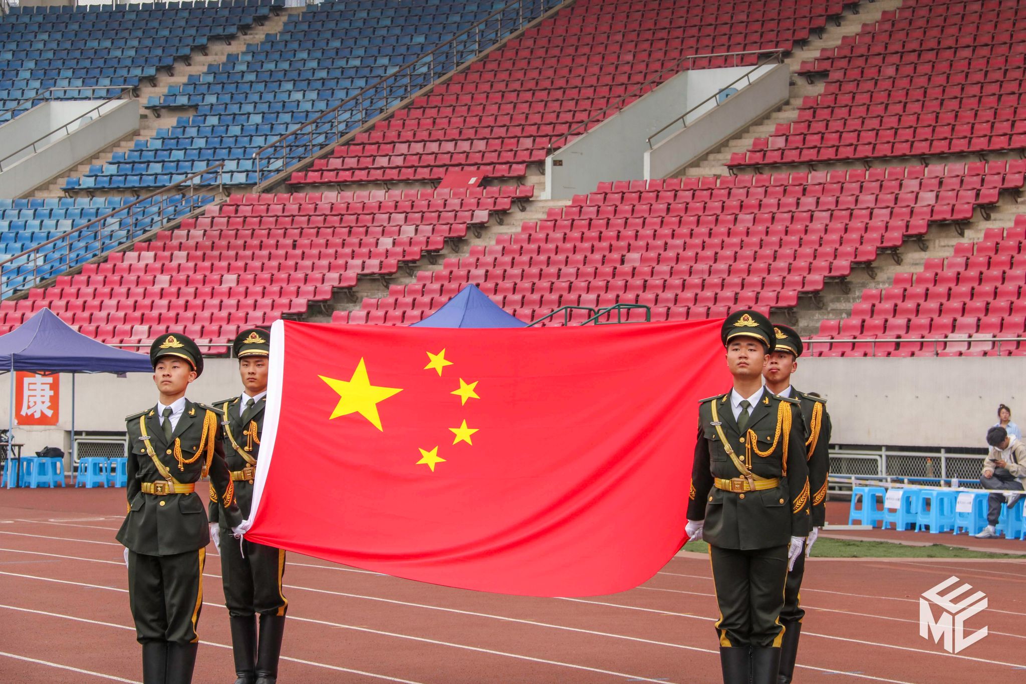 在所有班级展示完毕后,国旗班出旗,国旗护卫队队员身着整齐的制服,动作整齐划一,正步声和着鼓点,震撼人心。随着乐声响起,国旗护卫队队员高高举起鲜艳的五星红旗,全体师生起立奏唱国歌。