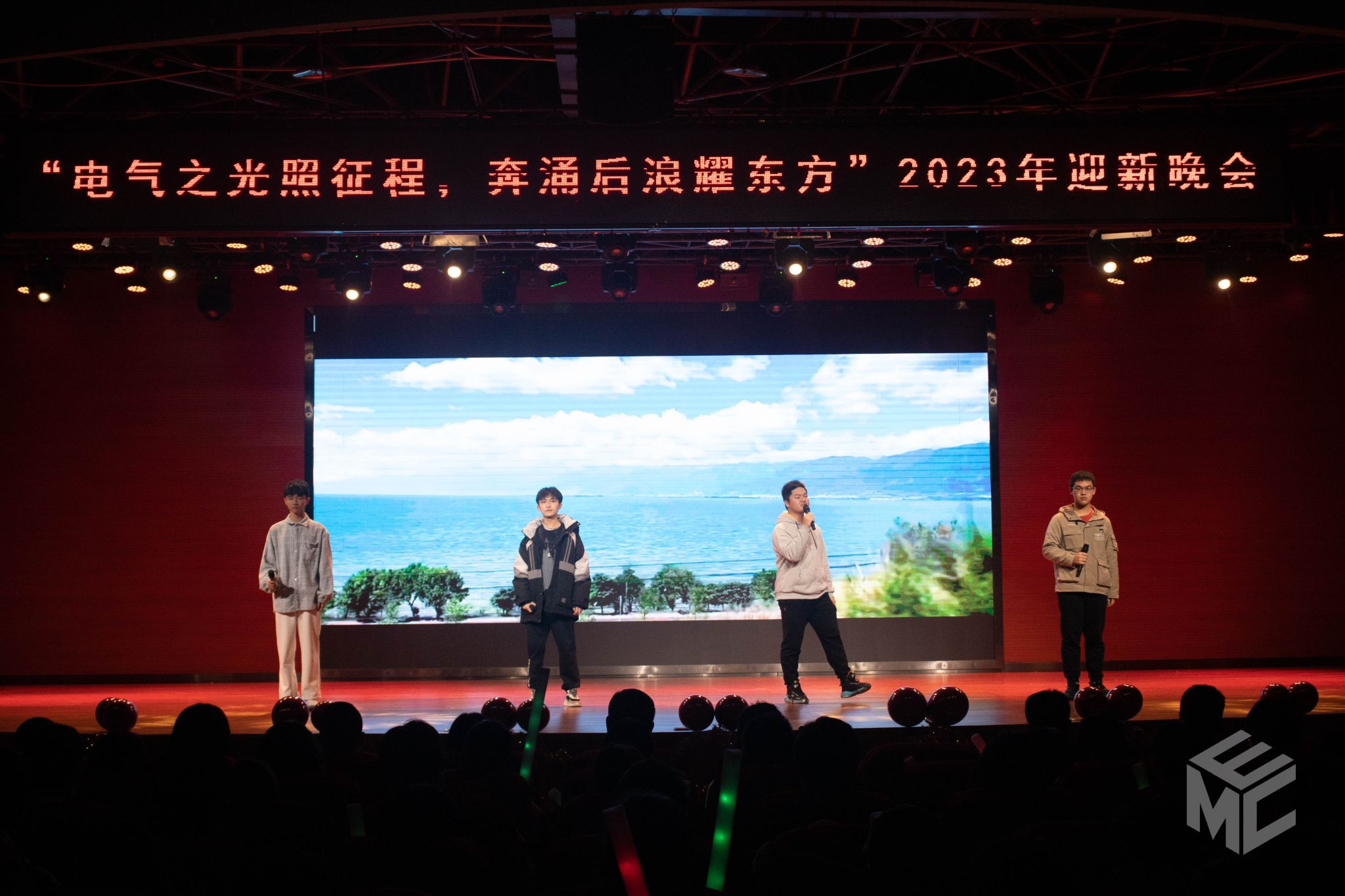 晚会下半场的主题为“以梦为马·不负韶华”,电气2023-04班的合唱《奔跑》为大家带来了随风奔跑、青春昂扬的旋律;其次是电子2023-04班的舞蹈《燃动青春》,展现了电气人的热情奔放;随后,电气2023-09班的情景剧《家庭电视台》回忆了家庭中温馨的点滴片刻;电子2023-01班、电气2023-08班、电气2023-09班和电气2023-11班共同合作的《歌曲串烧》,诠释了团结乐观的电气风貌;电子2023-02班的舞蹈《被子舞》和电气2023-05班的合唱舞蹈《明天你好》,展现了电气学子的创新思维;电气2023-07班的独唱《不遗憾》、电气2023-10班的舞台剧《达拉崩吧》和电子2023-01班的合唱《入海》,展现了各新生班级旺盛的青年活力。在晚会的最后,2023级辅导员老师詹睿、罗霁轩与九位辅导员助理为全场观众带来隐藏节目《爱你+岁月神偷》,回忆了迎新点滴,对新生大学四年的时光送上美好的祝愿。