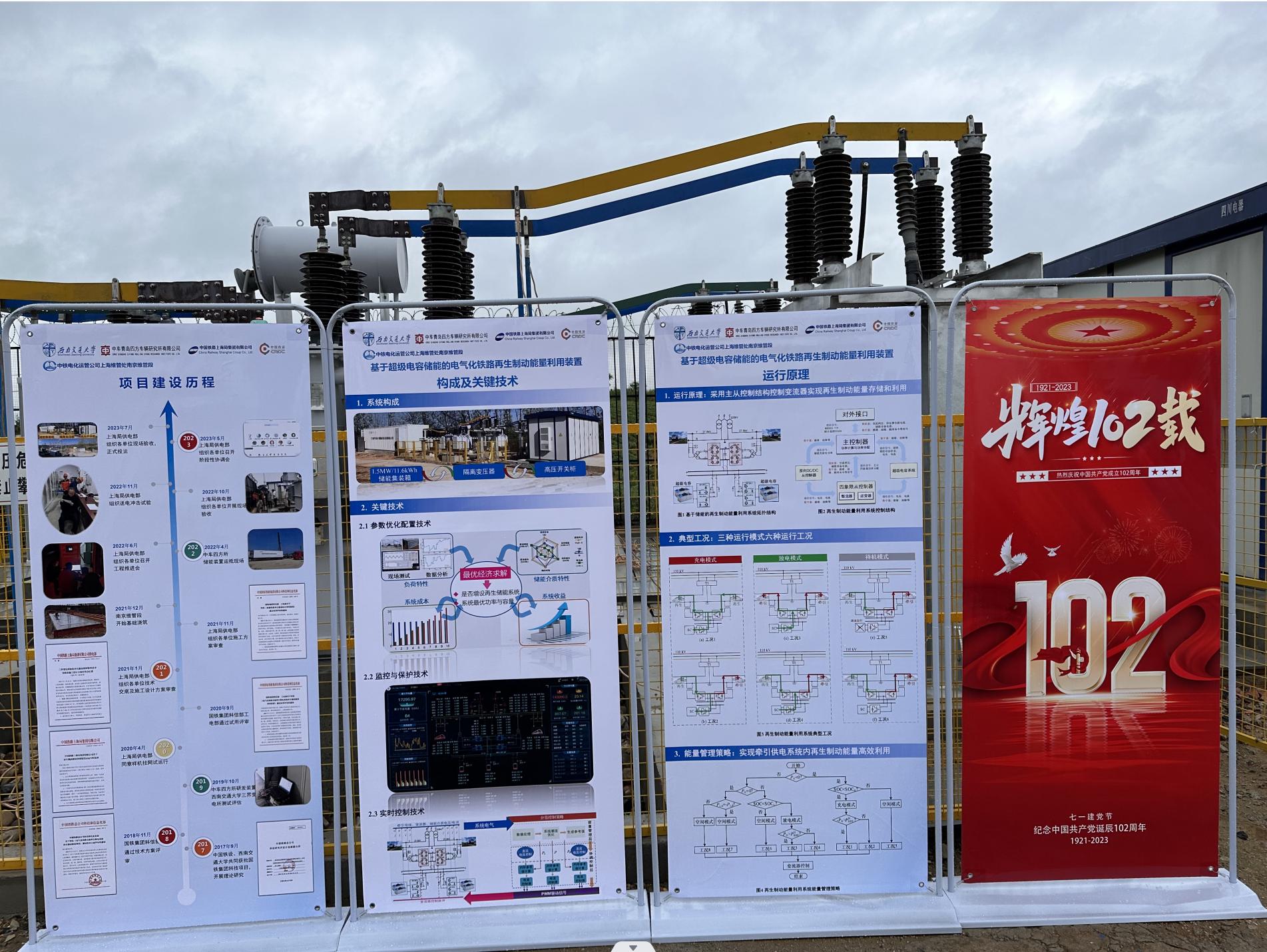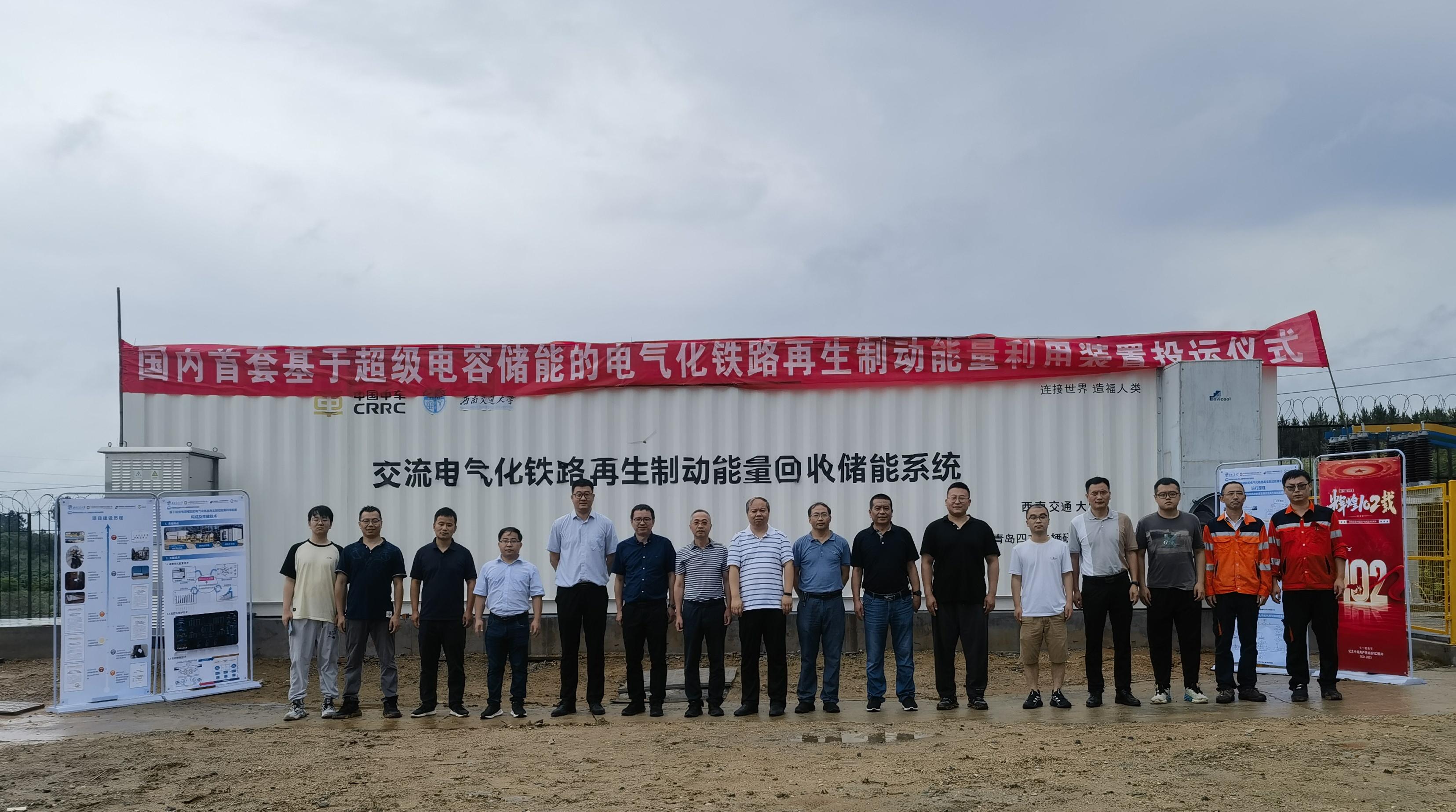 为贯彻落实国家“碳达峰、碳中和”和国铁集团“绿色低碳”的发展目标,在国铁集团科研项目《电气化铁路交流牵引供电系统再生制动能量利用技术研究》支持下,正妹av 何正友、胡海涛、王科课题组与中车青岛四方车辆研究所有限公司、中国铁路上海局集团有限公司供电部、中国铁路设计集团有限公司、南京供电段、南京维管段等单位在京沪铁路三界牵引变电所开展了国内首套“基于超级电容储能的电气化铁路再生制动能量利用装置”示范工程项目。历时6年,逐步完成了项目立项、技术方案评审、生产研发、试用评审、施工调试、试运行等全部工作。试运行2个月后,该装置于2023年7月7日正式投运。