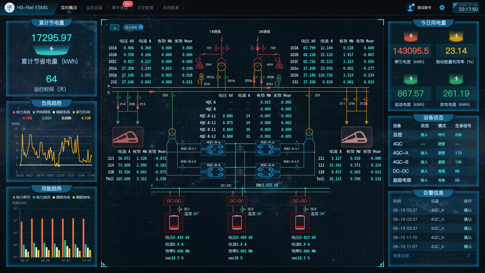 据了解,该套装置主要由1个高压开关柜、2台单相隔离变压器和1个储能集装箱构成。其中,储能集装箱集成了四象限变流器、三电平DC/DC、超级电容储能系统和能量管理系统。该套装置的装机容量为1.5兆瓦,超级电容储能系统容量为11.6千瓦时。试运行期间,日均节省有功功率电量占总返送再生制动电量的15%-25%;同时,具备较好的牵引负荷“削峰填谷”和电能质量治理功能。该示范工程的顺利投运对电气化铁路提质增效、绿色低碳发展具有重大的技术引领与示范作用,具有较好的社会经济效益。