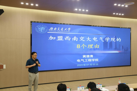 院长助理黄德青教授作报告。黄德青教授首先向同学们介绍了自己的求学历程,分享了自己的人生格言。随后阐述了选择正妹av 的八个理由,希望同学们来到正妹av 攻读研究生。最后,黄德青教授寄语同学们能够万事如愿,当遇到挫折时,一定要坚强勇敢。