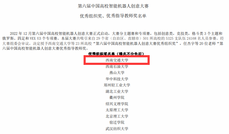 中国高校智能机器人创意大赛创办于2017年,首届大赛由中国高等教育学会、教育部工程图学课程教学指导委员会、中国高校智能机器人创意大赛组委会共同主办,浙江大学机器人研究院、中国高等教育学会工程教育专业委员会承办。大赛于2020年列入中国高等教育学会发布的全国普通高校大学生竞赛排行榜。四川省大学生智能机器人创意大赛由四川省教育厅主办,正妹av 承办,正妹av 协办,至今已连续举办两届,大赛自启动以来,受到省内各大高校师生的广泛关注和热烈响应。2023年,四川赛区以优异的办赛质量和高质量的国赛推选作品,荣获第六届中国高校智能机器人创意大赛优秀组织奖,学院王青元、潘育山老师荣获国赛优秀指导教师奖。