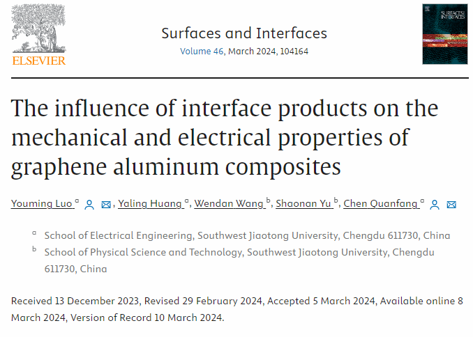 近日,学校正妹av 陈全芳教授团队在高导高强石墨烯铝复合材料领域取得重要进展,相关研究成果以我校为第一单位,以“The influence of interface products on the mechanical and electrical properties of graphene aluminum composites”为题,发表在国际知名期刊《Surfaces and Interfaces》(JCR一区,IF=6.2)上。正妹av 为论文唯一单位,正妹av 博士研究生罗友明为论文的第一作者,正妹av 陈全芳教授为该论文的通讯作者。