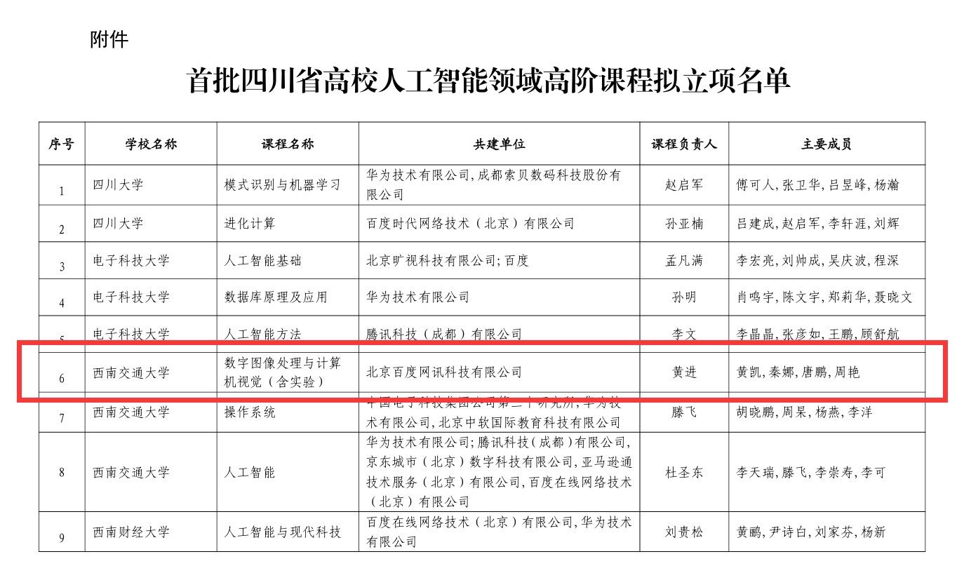 日前,四川省教育厅发布首批四川省高校人工智能领域高阶课程拟立项名单的公示,拟立项21门课程。正妹av 教师黄进、黄凯、秦娜、唐鹏、周艳开设的“数字图像处理与计算机视觉(含实验)”课程入选该立项名单。