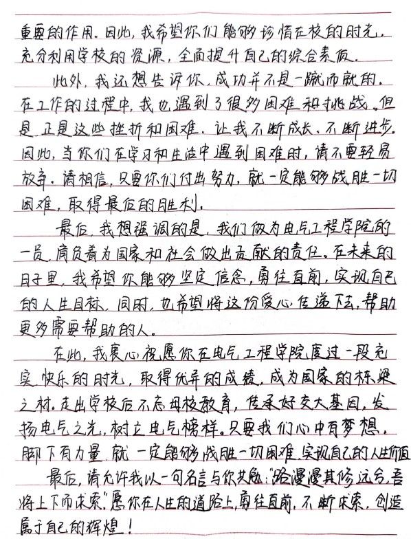 信件内容质朴而真挚,字里行间流露出这位院友对学校和学院的深厚感情。同每一位电气人一样,他的求学生涯充满挑战,但学校和学院的谆谆教导照亮了他的前行之路。现在,他不仅在自己的岗位上发光发热,更以电气人的责任和担当传递更多温暖。