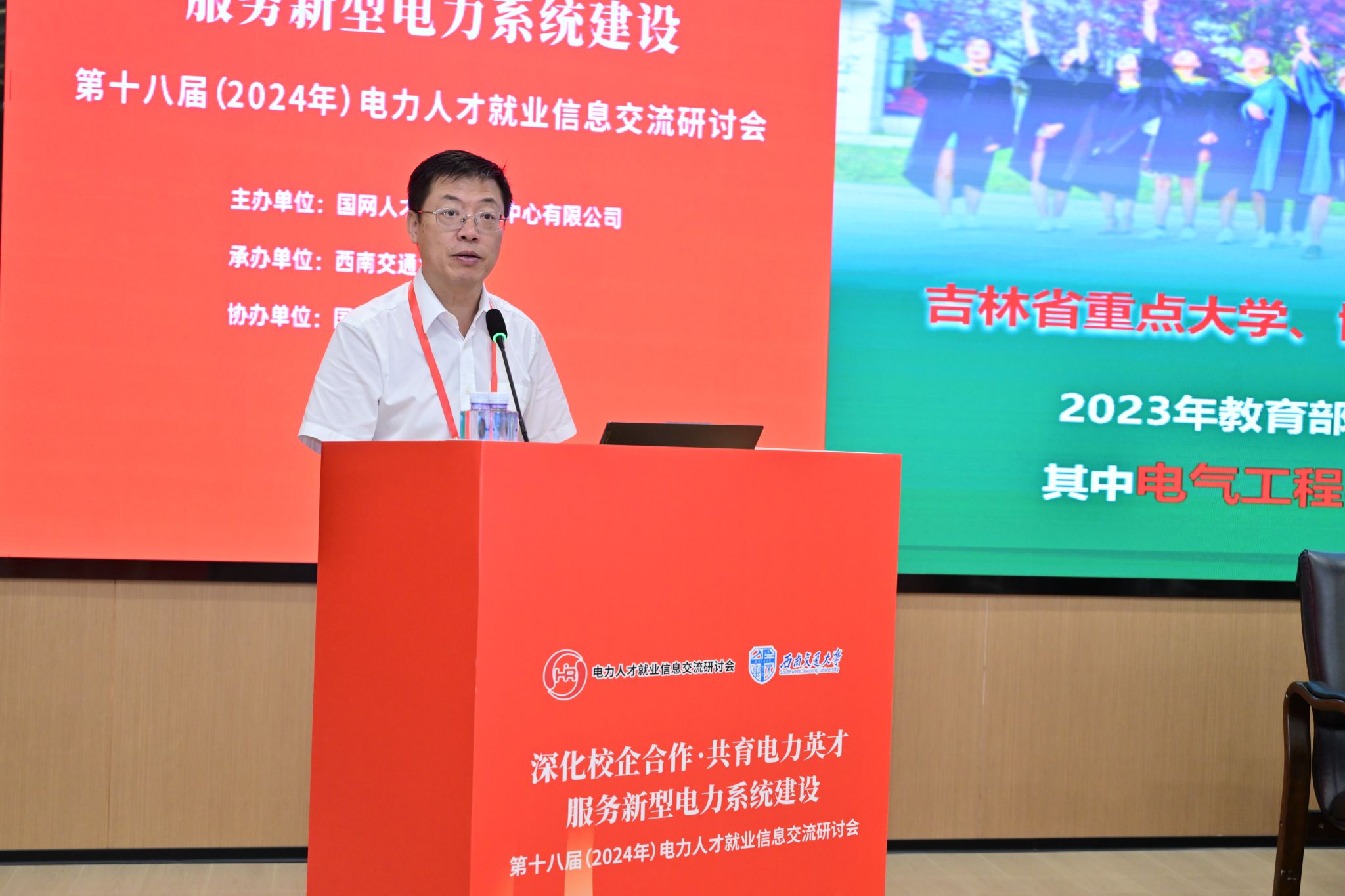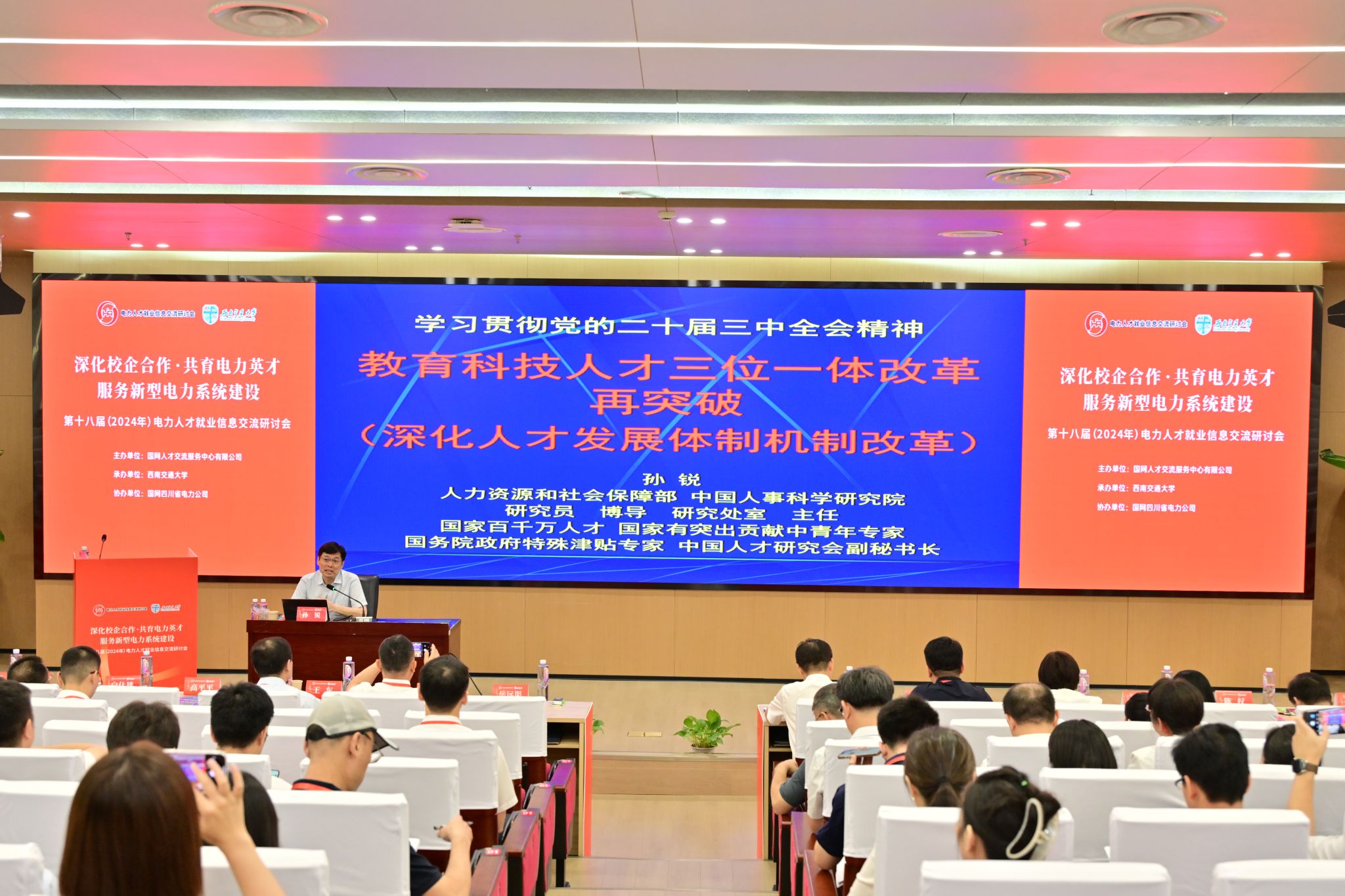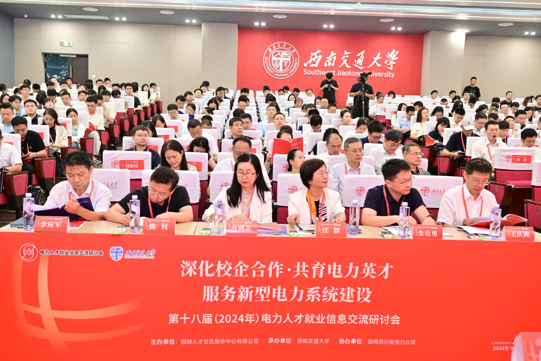 2024年9月12日,第十八届电力人才就业信息交流研讨会在正妹av 召开。本次研讨会由国网人才交流服务中心有限公司主办,正妹av 承办,国网四川省电力公司协办,来自国网各省公司、中国电科院等47家电力企业和清华大学、武汉大学、华北电力大学等33所院校共两百余名代表参加大会。本次交流研讨是我校首次承办全国电力系统行业会议,对加强校企交流、深化校企合作,提升人才培养质量,帮助我校毕业生进一步拓宽就业渠道有重要意义。