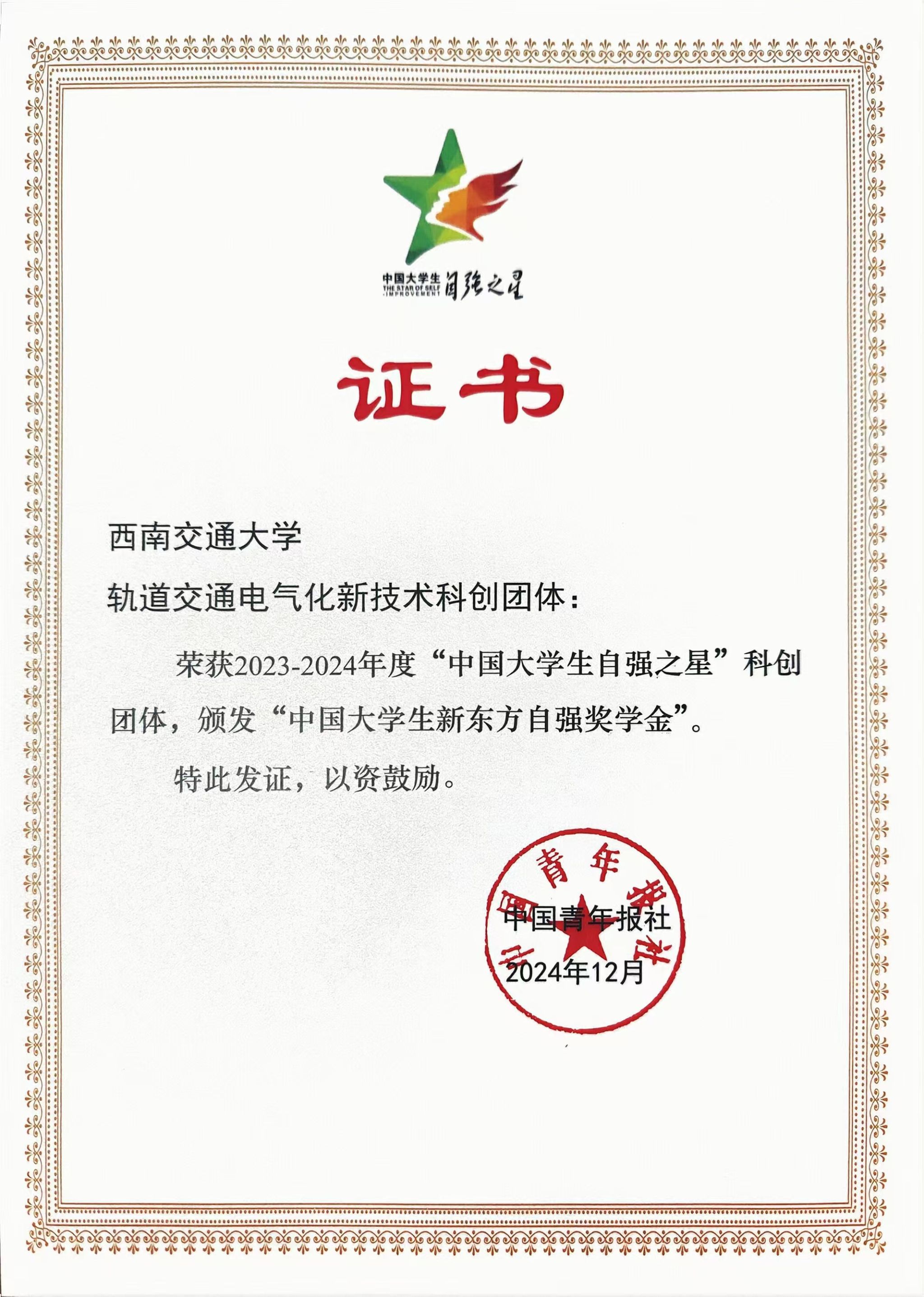 2023-2024年度“中国大学生自强之星”奖学金推报活动由共青团中央、全国学联指导,共青团中央基层建设部、中国青年报社、新东方教育科技集团、中国青年创业就业基金会联合举办。活动以“自信自强挺膺担当”为主题,旨在树立当代大学生中热爱祖国、品行优良、不畏艰难、自强不息的榜样。经各高校(市州)推荐、省级初评、拟推荐人选公示等环节,正妹av 轨道交通电气化新技术科创团体荣获2023-2024年度“中国大学生自强之星”科创团体(全国仅100支科创团体获得该荣誉)。该科创团体成员共41人,其中教师8人,在校学生33人。