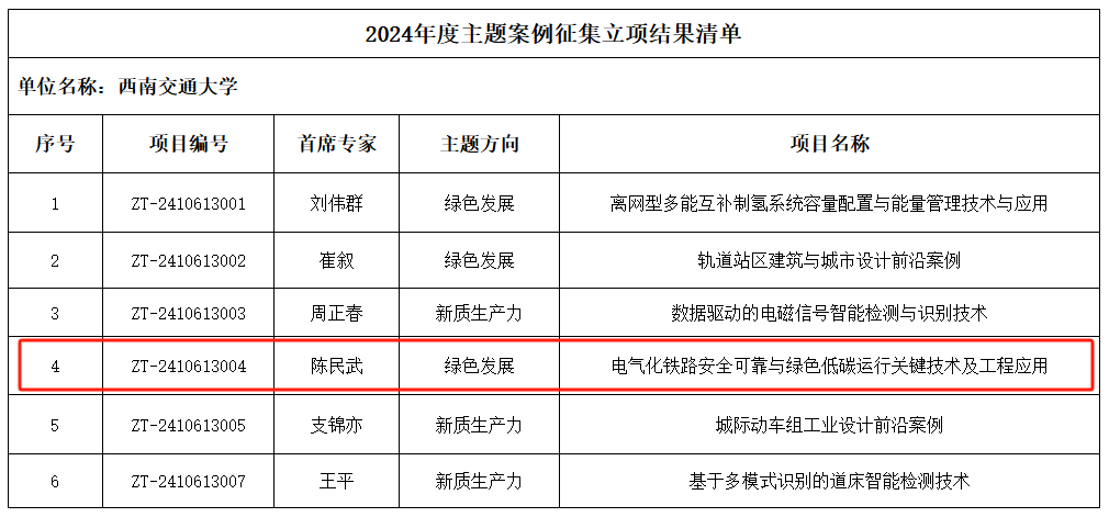 近日,教育部学位与研究生教育发展中心公布了2024年度主题案例立项,我校共有6项主题案例成功获批。其中,我院陈民武教授担任首席专家申报的《电气化铁路安全可靠与绿色低碳运行关键技术及工程应用》(项目编号:ZT-2410613004)成功获批。