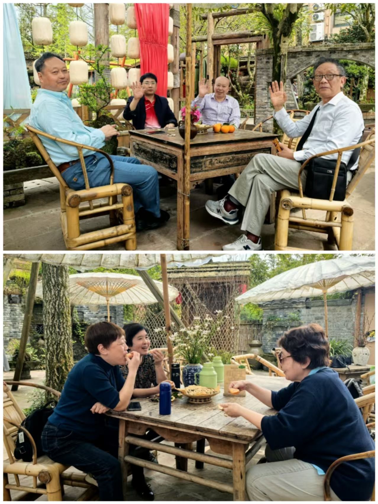 上午10时许,老师们乘车抵达都江堰问花村。时值春暖花开,园区内海棠、木绣球等竞相绽放,老师们漫步于花海小径,拍照留念,感受大自然的生机与诗意。中午,大家在特色农家乐共进午餐。餐桌上,老师们回忆往昔执教岁月,分享退休后的生活趣事,有人谈起孙辈的成长,有人交流养生心得,现场笑声不断。饭后,大家围坐在圆桌旁,开启交流时光。清茶氤氲,春风拂面,话题从健康养生延展到生活琐碎,大家彼此畅叙往事,情谊在春日暖阳中愈发醇厚。
