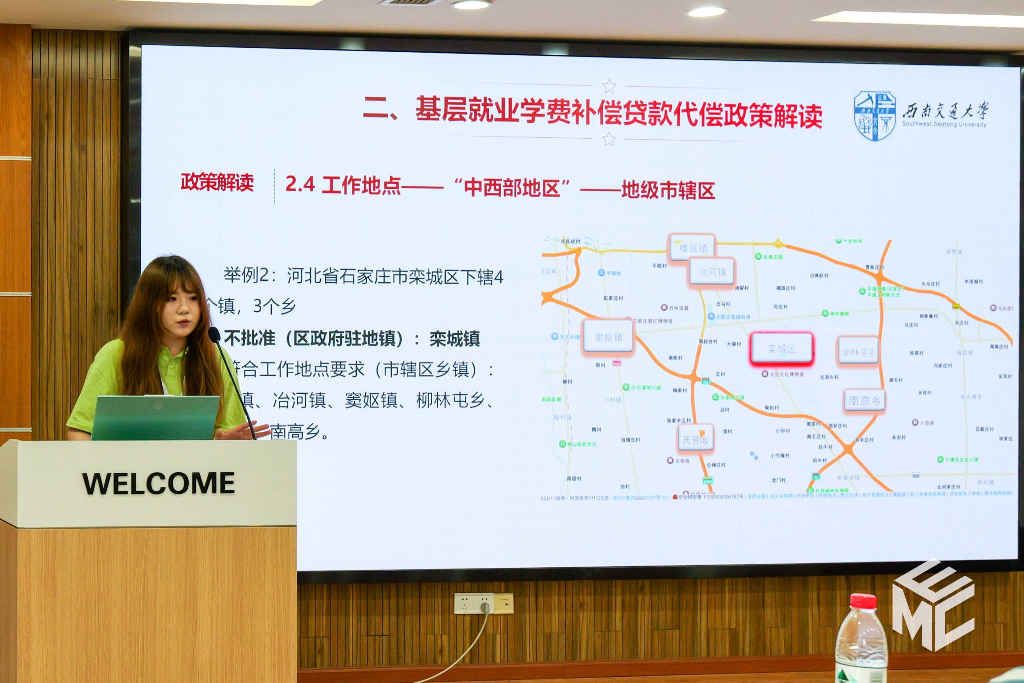 学生资助大使宣讲团成员陈俊帆同学则介绍了中央高校基层就业学费补偿国家助学贷款代偿资助政策,为大家一一解读政策的面向对象、申请条件、补偿代偿标准和申报流程等,并列举了审批过程中的常见问题。同事,还提醒大家可以通过扬华素质网、资助工作群等多渠道了解资助政策,掌握资助信息。