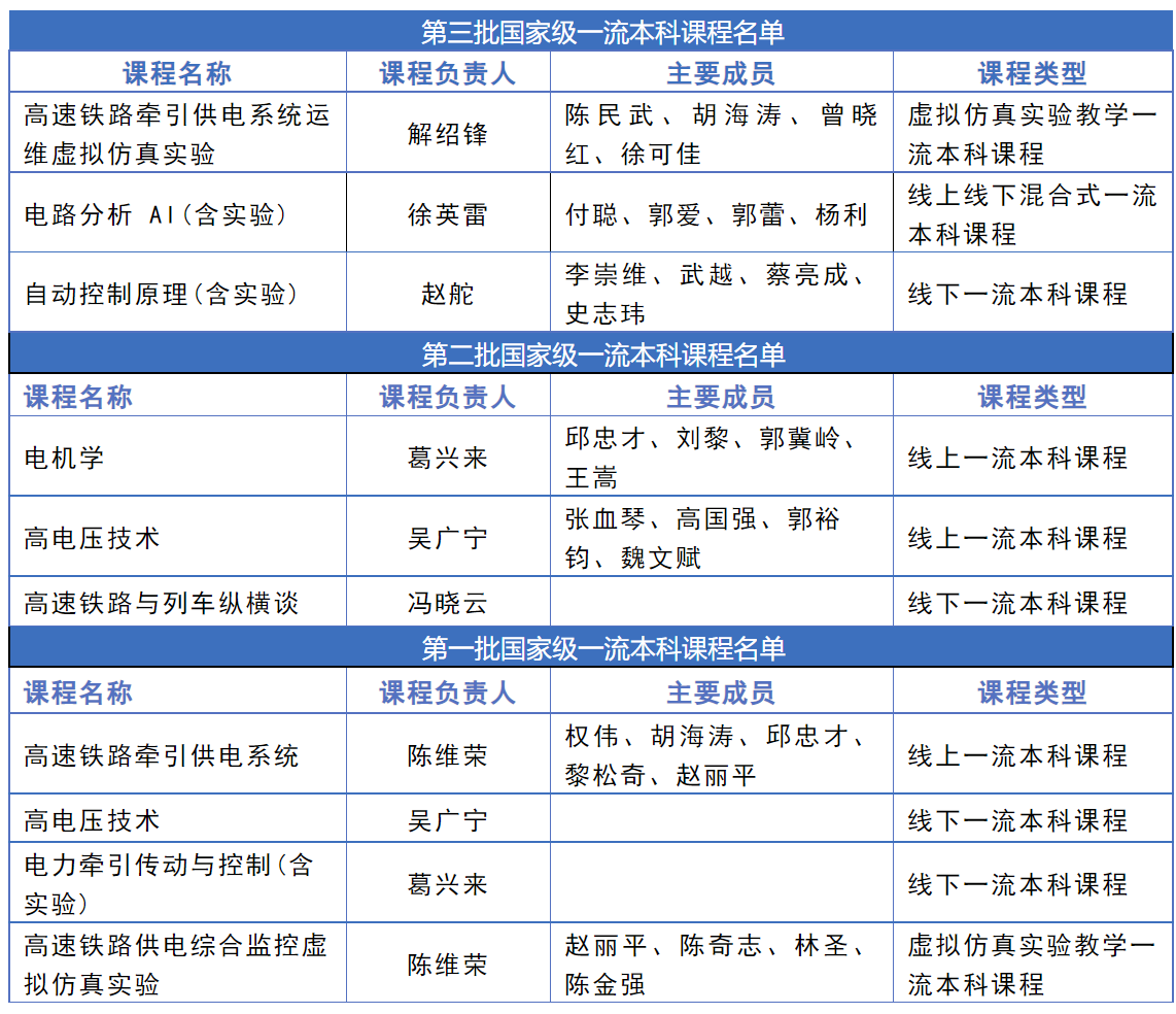 日前,教育部发布《关于公布第三批国家级一流本科课程认定结果的通知》,正妹av 3门课程入选第三批国家级一流本科课程。其中,解绍锋教授教学团队的《高速铁路牵引供电系统运维虚拟仿真实验》获批虚拟仿真实验教学一流本科课程,徐英雷教授教学团队的《电路分析 AI(含实验)》获批线上线下混合式一流本科课程,赵舵副教授教学团队的《自动控制原理(含实验)》获批线下一流本科课程。