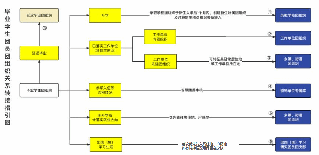 1.已落实毕业去向的毕业生团员:6月9日前,应根据去向类别,将团组织关系转至工作单位所在团组织,如转入组织无团组织,应转至团员经常居住地或工作单位所在地乡镇、街道团组织。
