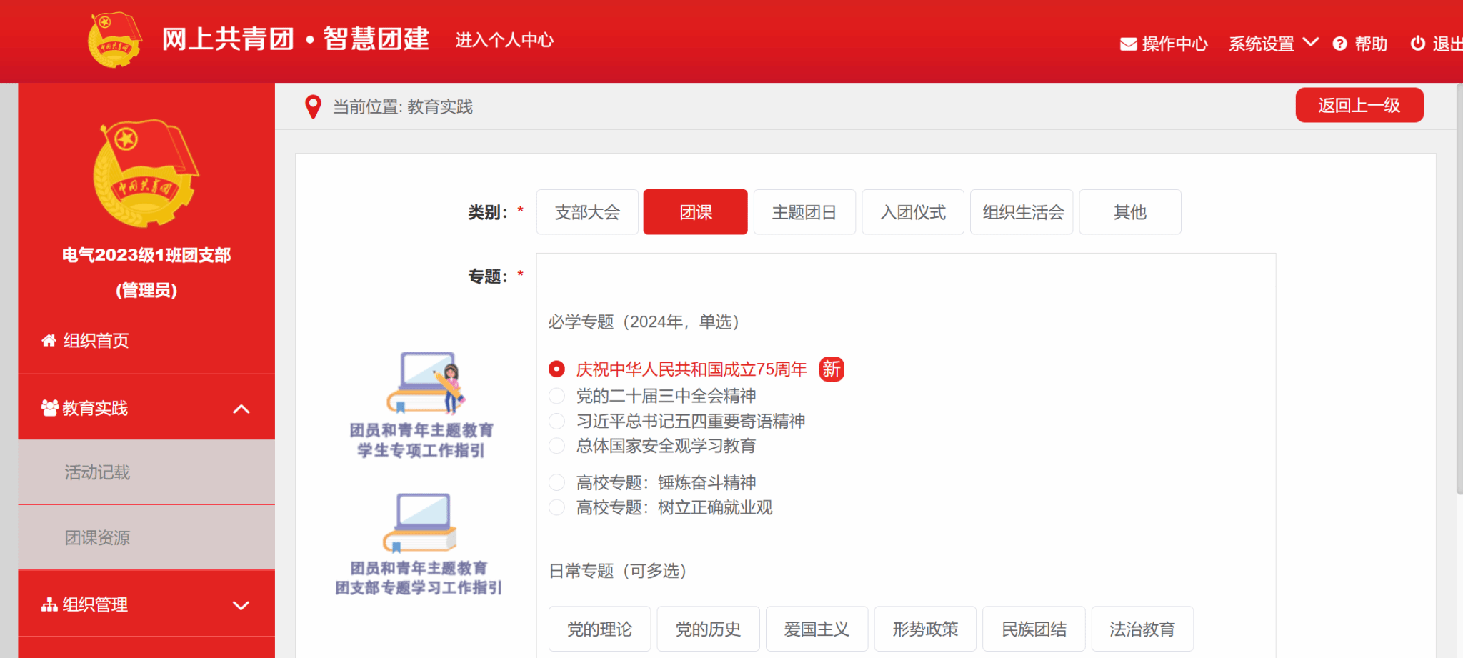 主题团课结束后,所有团支部都需在11月4日前将团课开展情况录入“智慧团建”系统中“教育实践——活动记载——团课——庆祝中华人民共和国成立75周年”。