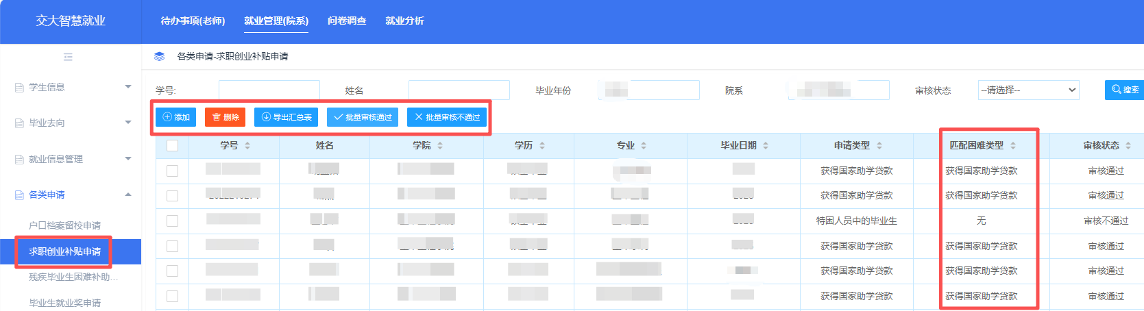 2.核对申请求职补贴的学生名单,并在智慧就业网导出《xx学院符合补贴要求无需提供证明材料学生明细表》(附件3)和《xx学院符合补贴要求需要提供证明材料学生明细表》(附件4),填写《正妹av 求职补贴申请汇总表》(附件5)。